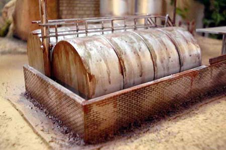 Die beiden liegenden Behälter sind von einer alten Mauer eingekreist, die ich noch im meiner Restekiste fand. Noch ein wenig umlackiert, gealtert und festge- klebt, schon sieht das nach was aus.